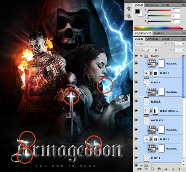 Once you are happy with the size and placement of the flares, select them all and place them into a Group Folder. I have also added some Hue/Saturation Adjustment Layers to some of the flares in order to desaturate them so they are white. All together I am only using about five flares but this step is also not an exact science. It helps add a bit of polish and sheen to your image so feel free to experiment with different sizes and colors as you see fit.